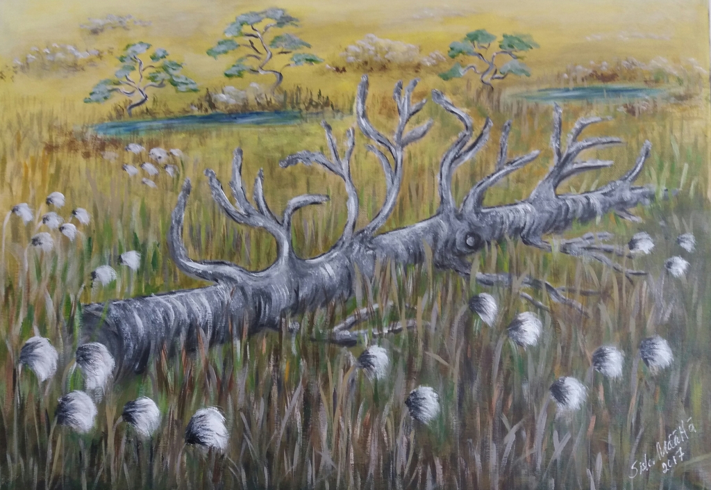 Tunnisteet: akryylimaalaus, laho runko, laho puu, suo, tupasvillasuo