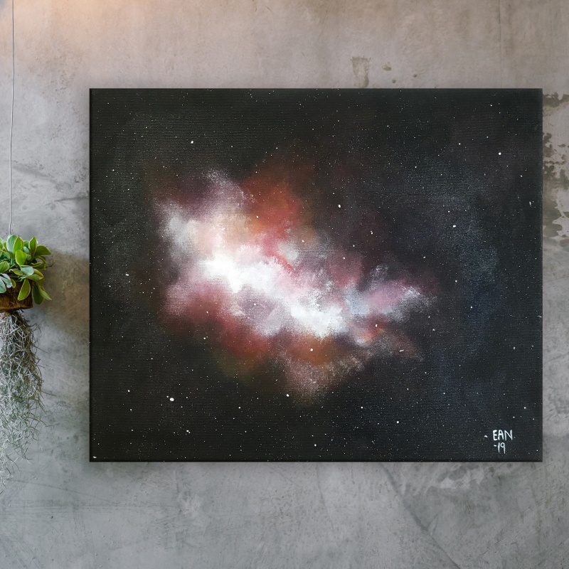 Kuvaus: Avaruusaiheinen abstraktimaalaus punertavissa sävyissä. Tämä keskikokoinen maalaus tuo väriä ja eloisuutta sisustukseesi. Teoksen reunat on maalattu ja se on ripustusvalmis, joten voit laittaa tämän seinällesi ilman erillistä kehystämistä.