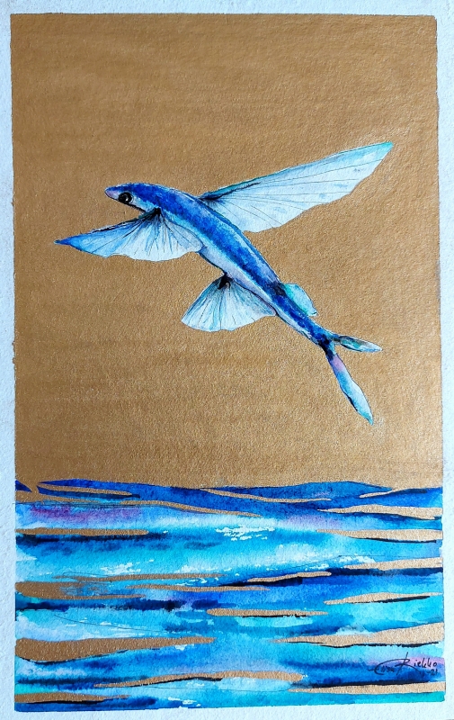 Kuvaus: 500g akvarellipaperille, akvarelli, kultamaali, tussi