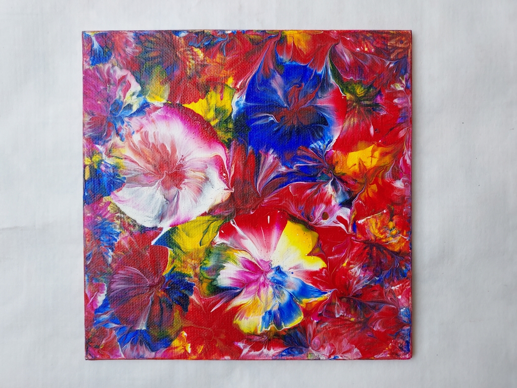 Kuvaus: Värikkäitä kukkia kaatovalutekniikalla kangaspahvipohjalle