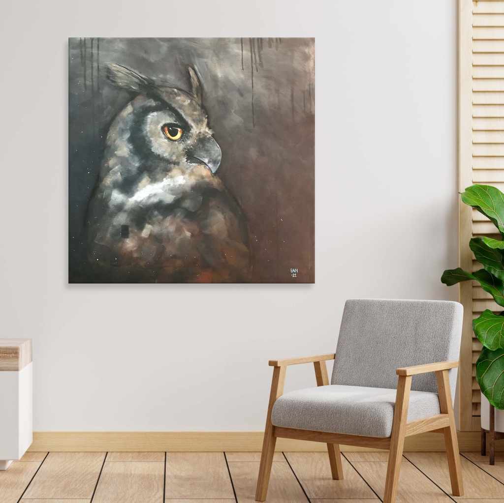Kuvaus: Tummapohjainen muotokuva huuhkajasta. Tämä teos sopii moneen sisustukseen! Teoksen reunat on myös maalattu, joten voit laittaa tämän seinällesi ilman erillistä kehystämistä.
