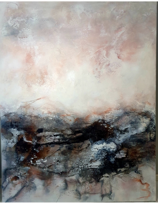 Kuvaus: Akryyleilla tehty sekatekniikalla canvaspohjalle. Ripustusvalmis. Takana on metallilanka.