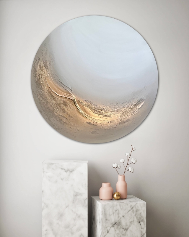 Kuvaus: Pyöreä maalaus, on ruskea, kullanhohtoinen ja on tekstuuria, halkaisija 80cm