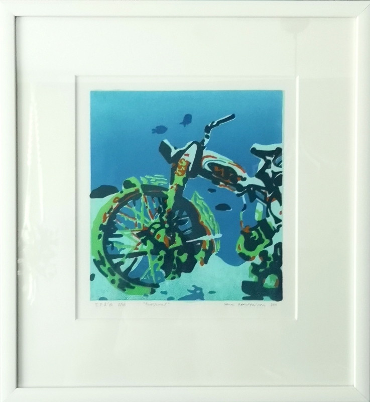 Kuvaus: Serigrafialla eli silkkiseulalla toteutettu grafiikan teos uponneesta pyörästä. 60€ / vedos, Tämä kehystetty vedos 2/5 ei myynnissä, mutta muut vedokset samanarvoisia.