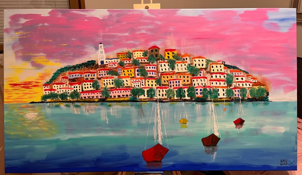 Kuvaus: Aikainen aamu Poroksella Kreikassa, akryyli kankaalle