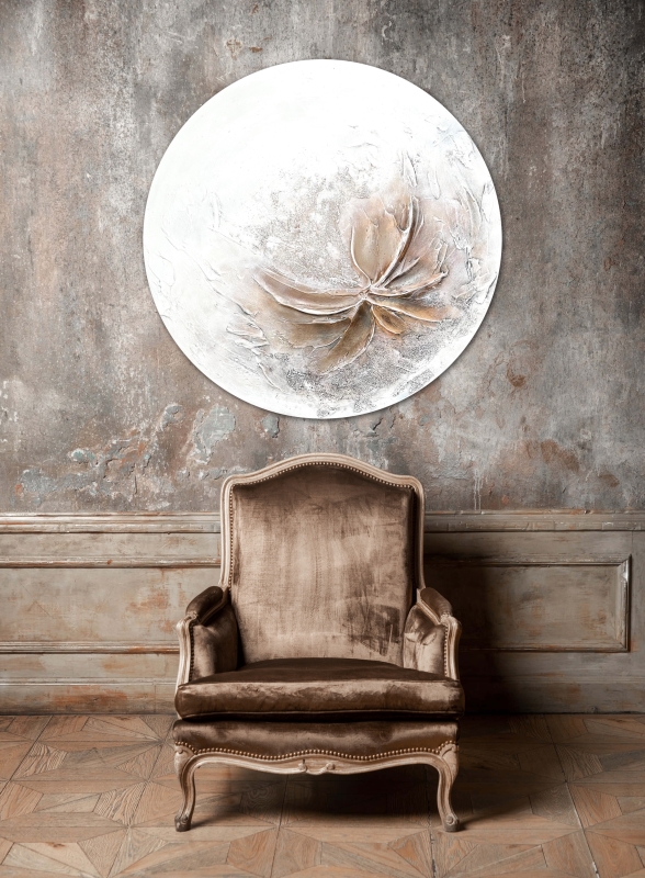 Kuvaus: Pyöreä taulu, valkoinen, beige, ruskeaa ja harmaa. Kuuluu Winter sarjaan