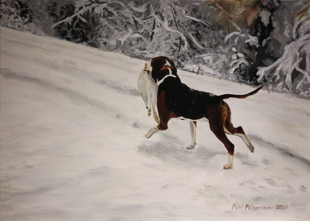 Kuvaus: Ajokoiramiehen unelmateos, saaliin kanssa lumisessa maisemassa