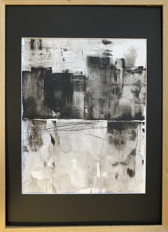 Kuvaus: Tammikehyksin, lasi, kuva otettu ilman lasia, abstrakti, tummanpuhuva teos. Valmis ripustettavaksi. Sopii moderniin tilaan.