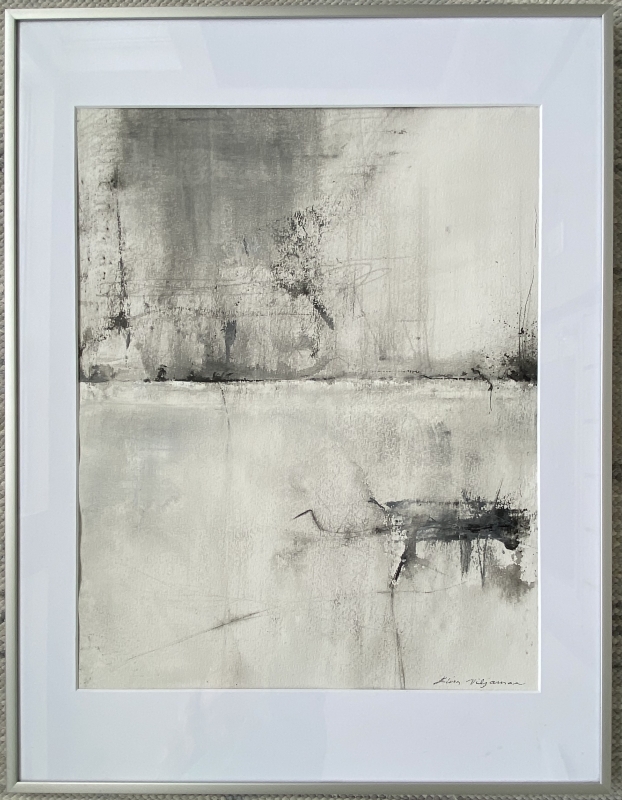 Kuvaus: Abstrakti, harmaanvalkoinen teos, hopeiset metallikehykset, lasi. Ripustusvalmis. Sopii moderniin, ja monentyyliseen sisustukseen ja tilaan.