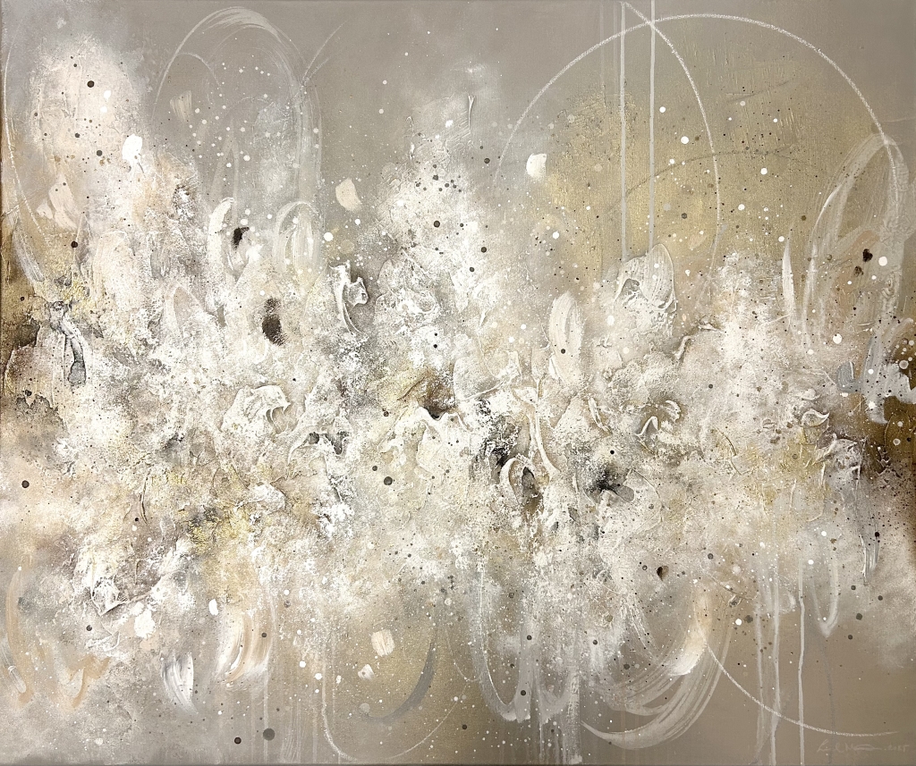 Kuvaus: Tekstuurinen teos neutraalilla värimaailmalla ja kullan hohteella.