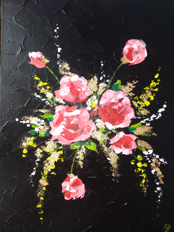 Kuvaus: Kullannhohtoinen akryylimaalaus kangaspahvipohjalla. Suojalakka ja signeeraus. Maalausprosessi: YouTube/DariaDash Art