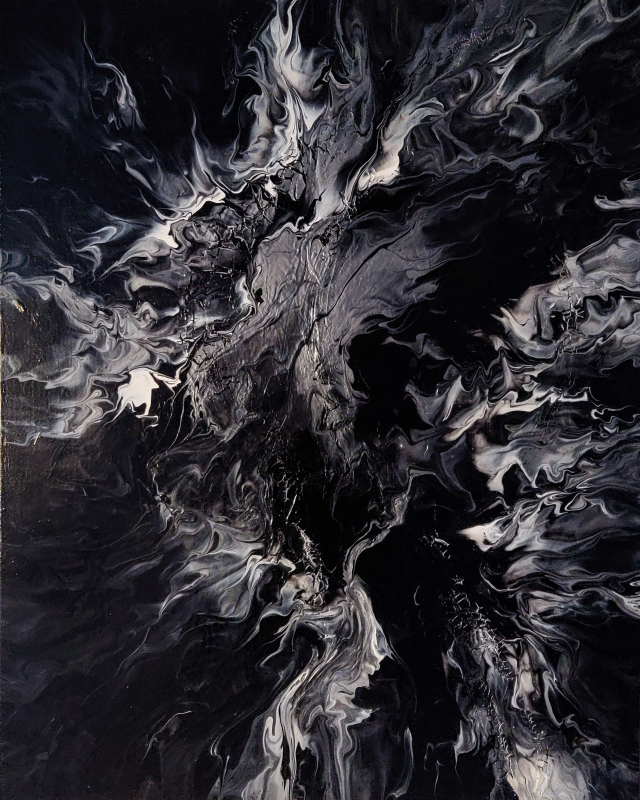 Kuvaus: Mustavalkohopeinen abstrakti teos jossa krakeloidut yksityiskohdat herättävät taulun eloon synkästä teemasta huolimattaan. Tämä teos on ollut esillä useimmissa yksityisnäyttelyissäni.