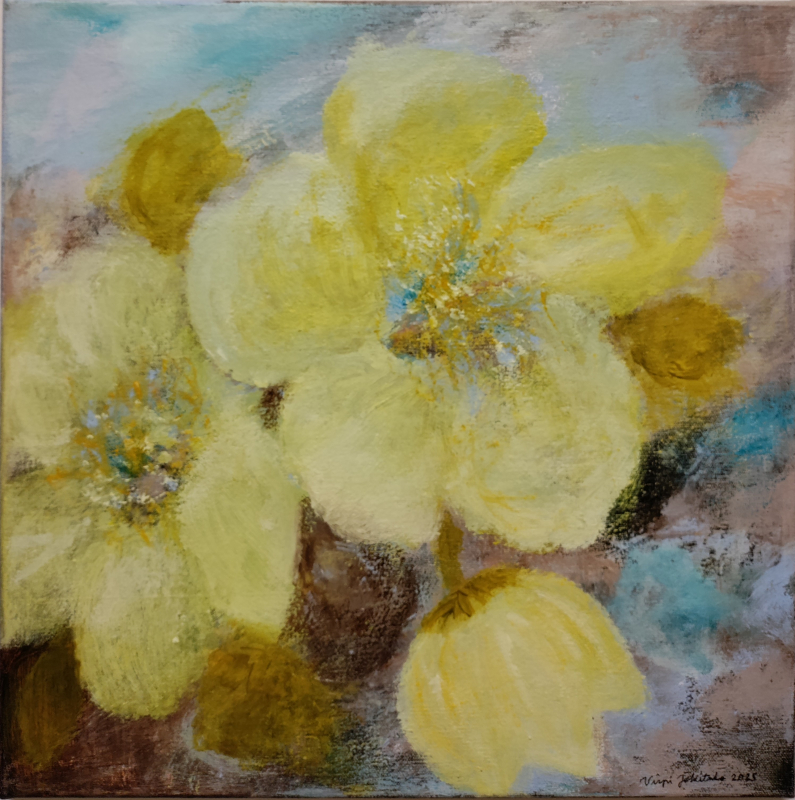 Kuvaus: Hento, värikäs kukka taulu. Akryylimaalaus. Signeeraus edessä ja takana. Ripustus valmis.