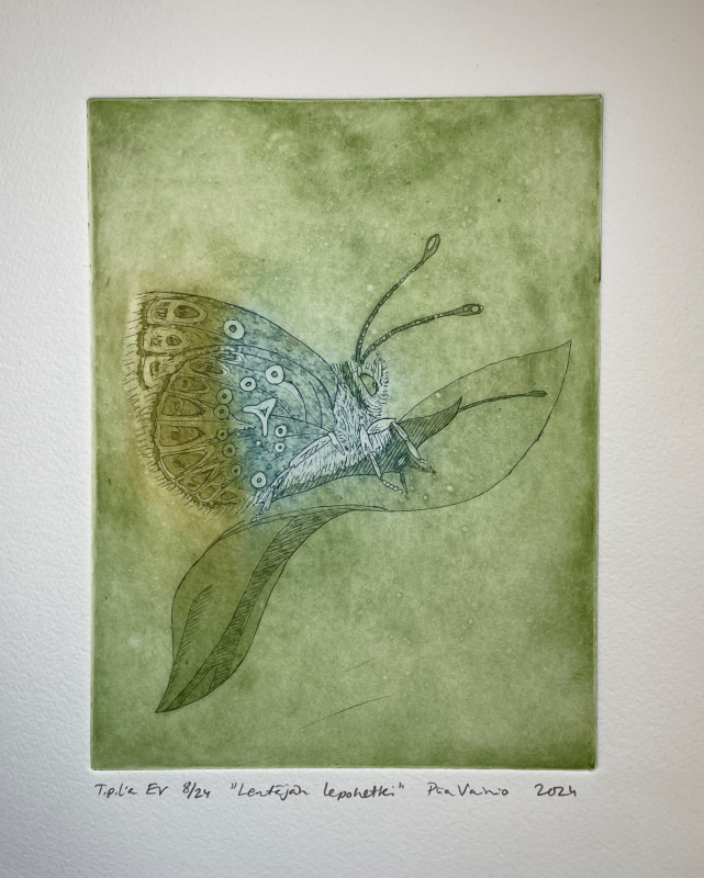 Kuvaus: Kehystämätön taidegrafiikan vedos Hahnemühlen 300 gsm syväpainopaperille, kuvan koko 19,7 x 14,8 cm, käytetyt tekniikat etsaus ja akvatinta kuparille, EV-sarjaan kuuluu 24 vedosta