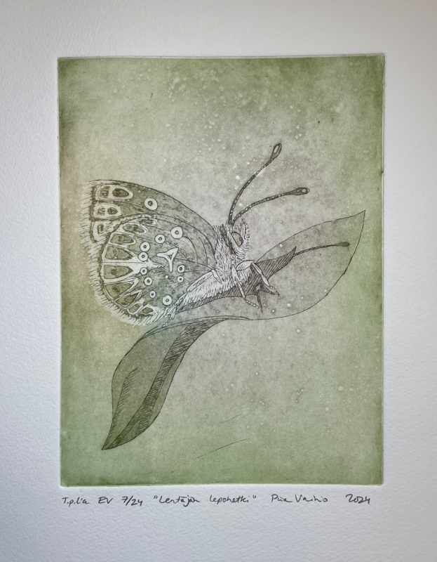 Kuvaus: Kehystämätön taidegrafiikan vedos Hahnemühlen 300 gsm syväpainopaperille, kuvan koko 19,7 x 14,8 cm, käytetyt tekniikat etsaus ja akvatinta kuparille, EV-sarjaan kuuluu 24 vedosta