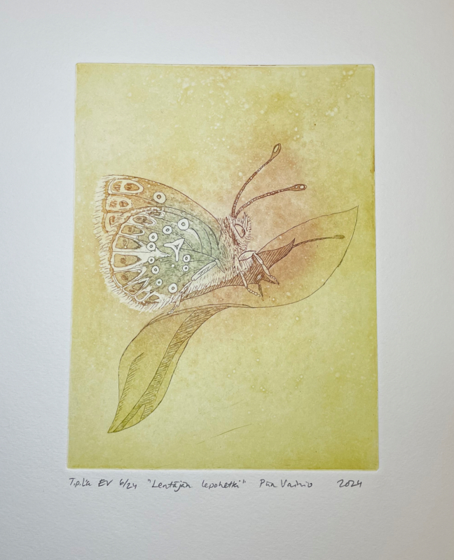 Kuvaus: Kehystämätön taidegrafiikan vedos Hahnemühlen 300 gsm syväpainopaperille, kuvan koko 19,7 x 14,8 cm, käytetyt tekniikat etsaus ja akvatinta kuparille, EV-sarjaan kuuluu 24 vedosta