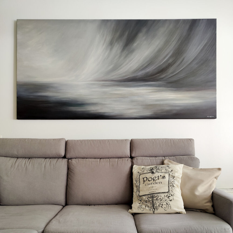 Kuvaus: Näyttävä, kaksimetrinen ja paksulle pinkopohjalle maalattu harmaavalkoinen akryylimaalaus, jossa on puoliabstrakti merimaisema. Ilmainen toimitus. Maalaus on syyskuun ajan esillä Terveystalo Pulssin ikkunagalleriassa Turussa, joten toimitus on lokakuun alussa. Maalaus kuuluu syksyllä 2025 julkaistuun kokoelmaani "Siellä missä on rauha". Lisätietoja sekä maalaukseen kuuluvan runon löydät nettisivuiltani www.marjaanamelentjeff.fi. Laita viestiä täällä tai osta suoraan verkkokaupastani.