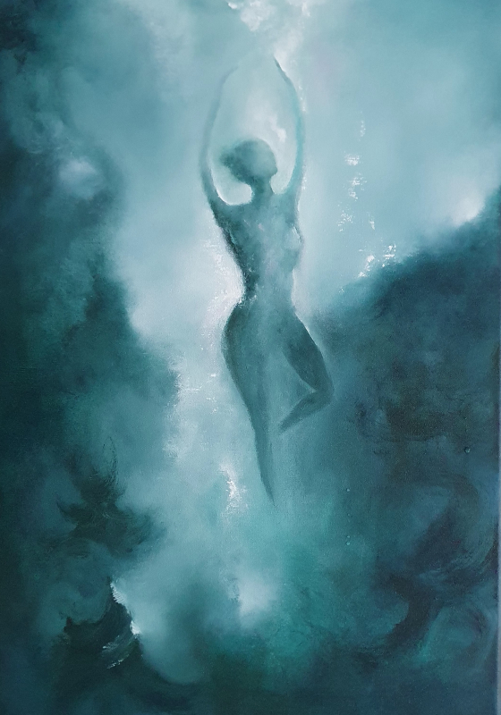 Kuvaus: Abstrakti akryylimaalaus, naishahmo