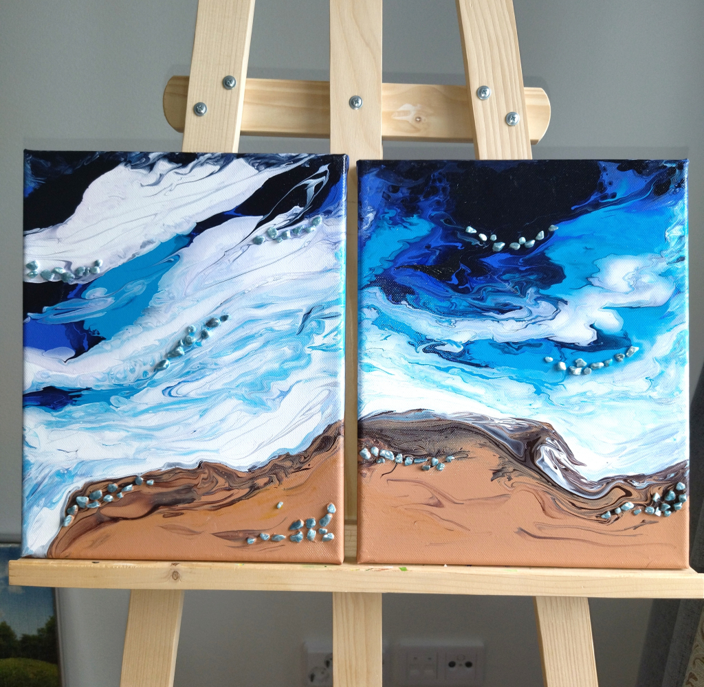 Kuvaus: Meriaiheinen akryylimaalaus kankaalla, jossa on koristekiviä 2kpl. Ripustusvalmiit. Teos on kiilapuissa eikä tarvitse erillistä kehystä. Ilmainen toimitus