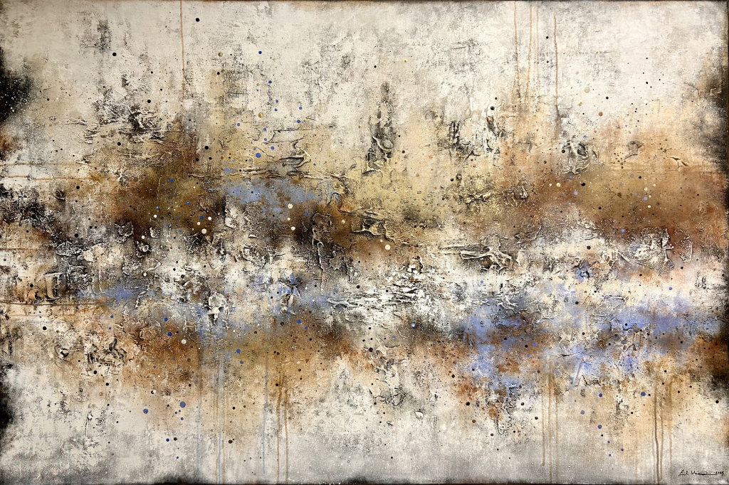 Kuvaus: Rouheinen ja tekstuurinen teos, jossa kylmää sinistä ja ruskean eri sävyjä. Kullan hohde luo kauniisti valoa teokseen.