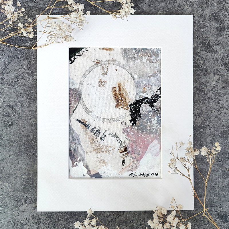 Kuvaus: ”Kaiken tasapaino” on teos, joka kuvastaa elämän eri osa-alueiden välillä tasapainoilua. Kaiken sen tasapainoilun joukosta – ja kenties juuri tasapainoilusta johtuen – voi arjessa löytää paljon kauneutta. Kehyksen koko 23×28 cm, passepartoutin koko 20×25,5cm, kuva-aukko 12x17cm. Maalauksen voi ostaa sellaisenaan passepartoutin kanssa ja kehystää itse (115€), tai sen voi ostaa kehystettynä mustaan tai valkoiseen kehykseen (140€). Lisätietoja: https://marjaanamelentjeff.fi/tuote/kaiken-tasapaino-2025/