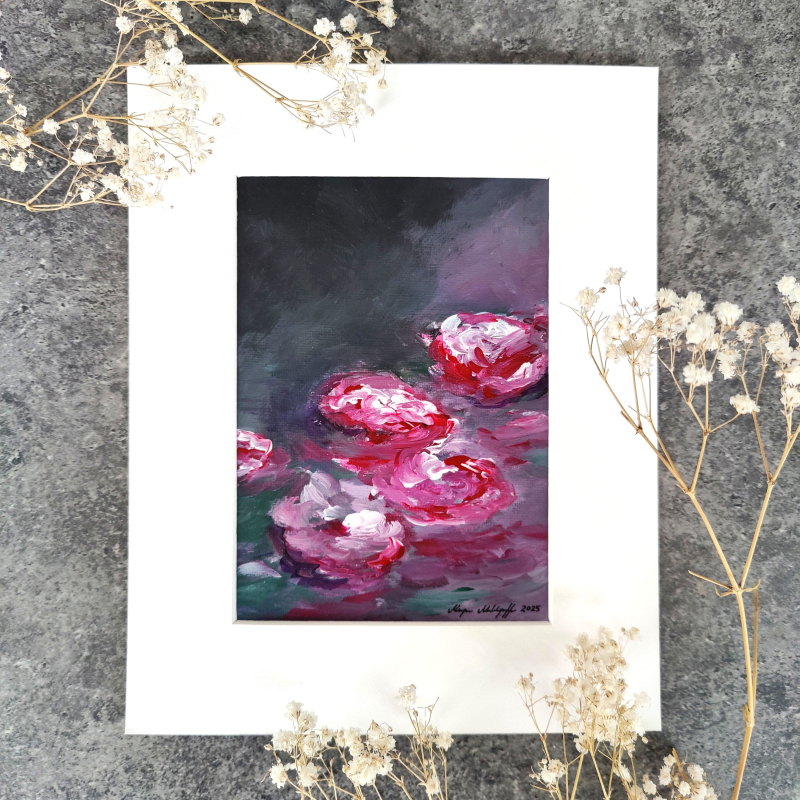 Kuvaus: ”Heijastuksia” ikuistaa sen rauhallisen hetken, jossa hiljaa kesäyössä avautuvien kukkien terälehdet heijastuvat tyynen järven pinnasta. Pimeyden keskellä tapahtuvassa hetki kuiskii rauhallista, mystistä ja salailevaa tunnelmaa. Kehyksen koko 23×28 cm, passepartoutin koko 20×25,5cm, kuva-aukko 12x17cm. Maalauksen voi ostaa sellaisenaan passepartoutin kanssa ja kehystää itse (145€), tai sen voi ostaa kehystettynä mustaan tai valkoiseen kehykseen (170€). Lisätietoja: https://marjaanamelentjeff.fi/tuote/heijastuksia-2025/