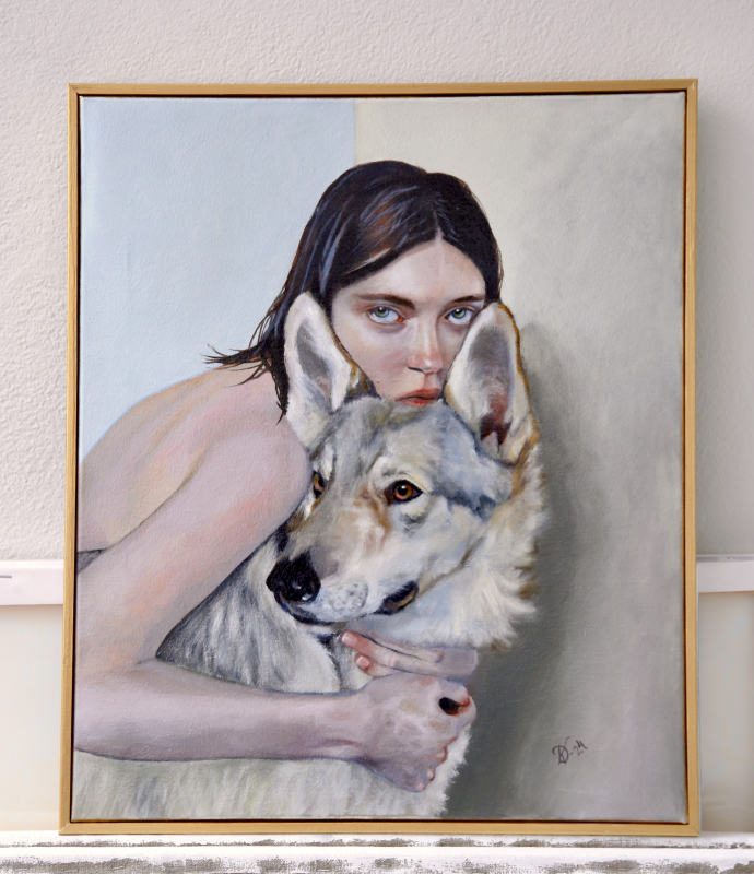 Kuvaus: Olen hakenut tähän maalaukseen intensiivisen tunnelman. Naisen ja koiran katseet ovat rauhallisia, luottaen katsojaan. Heleät vaaleat sävyt tekevät teoksesta unenomaisen. Se kutsuu sinut sisään syvään, pysyvään yhteyteen, joka koskettaa ja jää sydämeen.