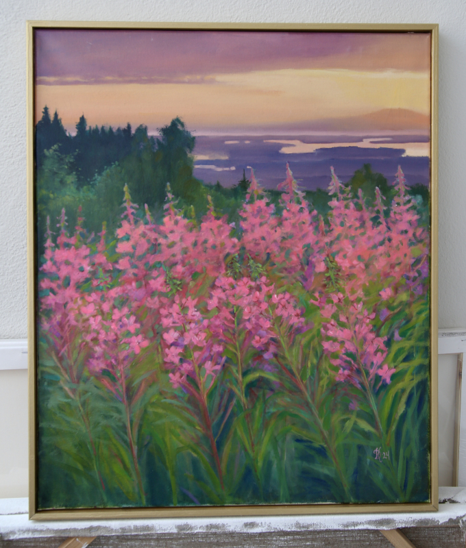 Kuvaus: Maalaus kutsuu sinut vaeltamaan kesän suloisesta lämmöstä ja avarassa maisemassa jossa pinkit kukat hohtavat lämpimässä auringonlaskun valossa. Kesä, vapaus ja suomalainen suvi kohtaavat ja horisontti jatkuu silmänkantamattomiin. Maalauksen pohja: kiilapuukehys/pohjustettu kangas. Valmis työ vernissoitu ja kehystetty itse puulistalla koko: 3 cm x 0,7 cm josta kapeampi puoli kuvan puolella. Kehys on maalattu kullan väriseksi ja se ei peitä kuvaa, ripustusvalmis.