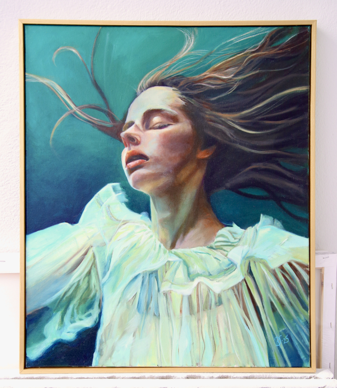 Kuvaus: Tässä maalauksessa lämmin sininen vesi kietoutuu sukeltajan ympärille. Hetki on rauhallinen, äänetön tila joka vie pois kiireen ja kontrollin, olet vain tässä, ihanassa hetkessä. Tämä teos kutsuu katsojaa antautumaan sen syvään ja puhuttelevaan levollisuuteen kuin kauniiseen ja herkkään sinfoniaan. Maalauksen pohja: kiilapuukehys/pohjustettu kangas. Valmis työ vernissoitu ja kehystetty itse puulistalla koko: 3 cm x 0,7 cm josta kapeampi puoli kuvan puolella. Kehys on maalattu kullan väriseksi ja se ei peitä kuvaa, ripustusvalmis.