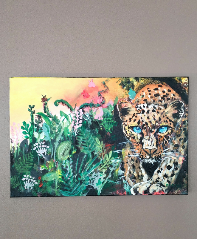 Kuvaus: Värikäs akryylimaslaus, jossa sadunomaista viidakon tunnelmaa ja jaguaari hiipimässä.