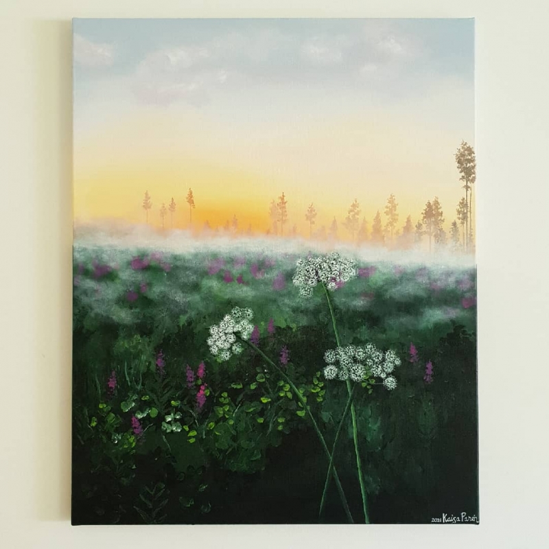 Katsojalle toivon pysähdyksen arvoisia hetkiä taiteen äärellä. Maalaan intuitiota kuunnellen tunnelmaa ja aistikokemuksia, ennemmin kuin jäljittelisin näkemääni valokuvan kaltaiseksi. Herkkyys, läsnäolo ja voimaantuminen ovat sanoja, joilla asiakkaat usein kuvaavat maalauksia.