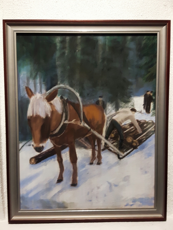 Kuvaus: Pastelliliidun pehmeät jäljet taulussa muistuttavat meitä ajasta. jolloin kiire ei mitattu minuuteissa, vaan askelissa ja kestävyydessä. Taulun "raatajat" eivät valita-he ovat osa metsää, osa talvea ja osa ketjua, joka on rakentunut tätä maata sukupolvien ajan. Työpäivän päätteeksi talissa odottaa tuore heinä ja tuvassa lämmin leivinuuni.