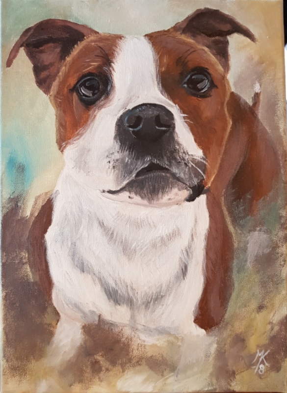 Kuvaus: Muotokuva koirasta/kissasta toiveiden mukaan. Tässä yksi esimerkkimaalaus, ko maalaus ei myynnissä.