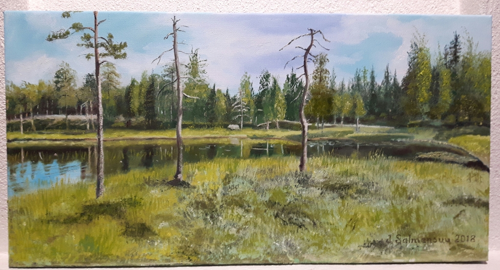 Kuvaus: Luoston hiljainen vartija. Ahvenlammella ei ole kiire mihinkään. Se on paikka, jossa vaeltaja laskee reppunsa mättäälle, sulkee silmänsä ja kuuntelee vain tuulen suhinaa tunturikoivikossa. Tämä taulu vangitsee juuri sen hetken: rauhan, jota vain pohjoinen erämaa voi tarjota.