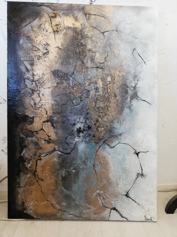 Kuvaus: Abstrakti maalaus. Rouhea pinta, sekatekniikka. Ripustusvalmis, metallilanka takana. Petroolin ja kullan sävyjä.
