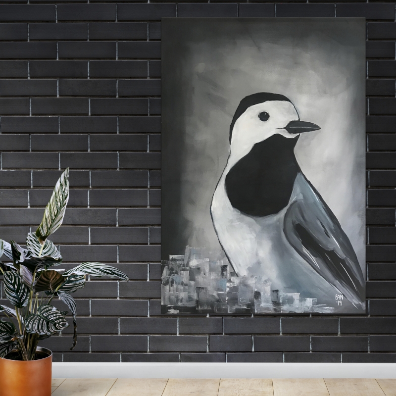 Kuvaus: Harmaasävyinen muotokuva monille tutusta pihapiirin linnusta. Tämä suurikokoinen västäräkkimaalaus sopii moneen tilaan. Teoksen reunat on maalattu ja se on ripustusvalmis, joten voit laittaa tämän seinällesi ilman erillistä kehystämistä.