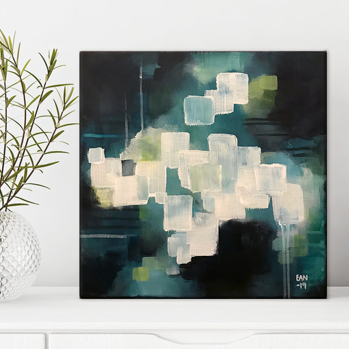Kuvaus: Pieni sinisävyinen akryylimaalaus piristää sisustuksesi! Tämä teos on ripustusvalmis ja sen reunat on maalattu, joten voit laittaa sen seinällesi ilman erillistä kehystämistä.