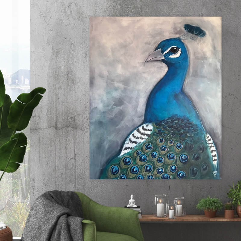 Kuvaus: Suurikokoinen maalaus riikinkukosta sinisten sävyjen ystävälle! Tämä teos on ripustusvalmis ja sen reunat on maalattu, joten voit laittaa tämän seinällesi ilman erillistä kehystämistä.