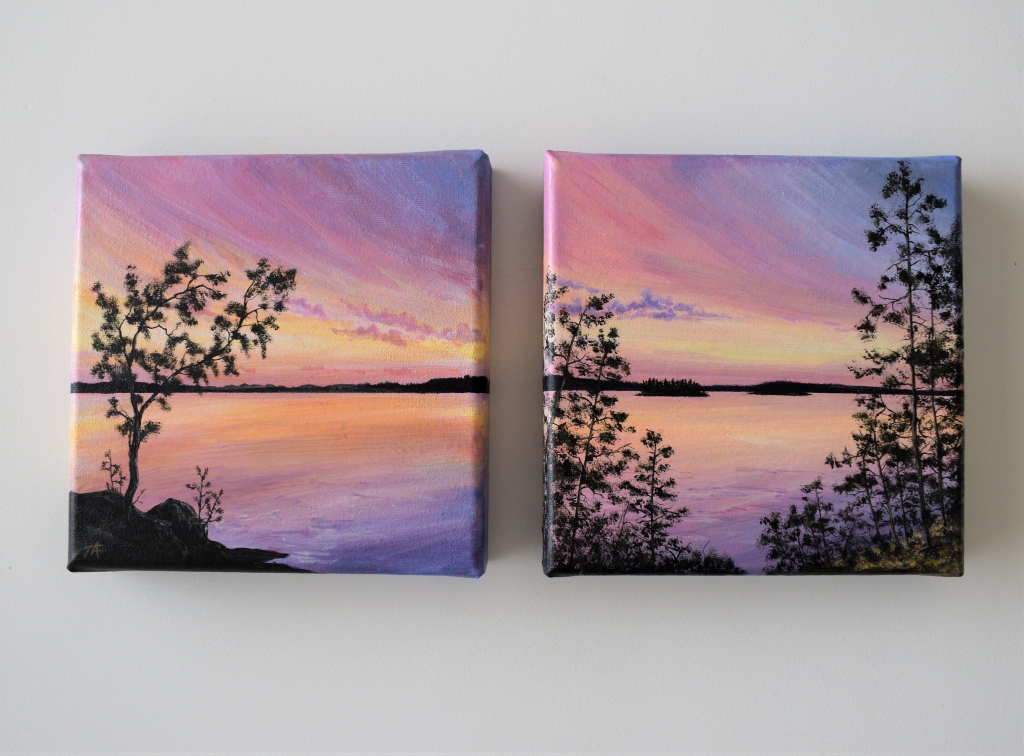 Kuvaus: Akryylimaalaus kankaalle. Teokset myytävissä myös erikseen.