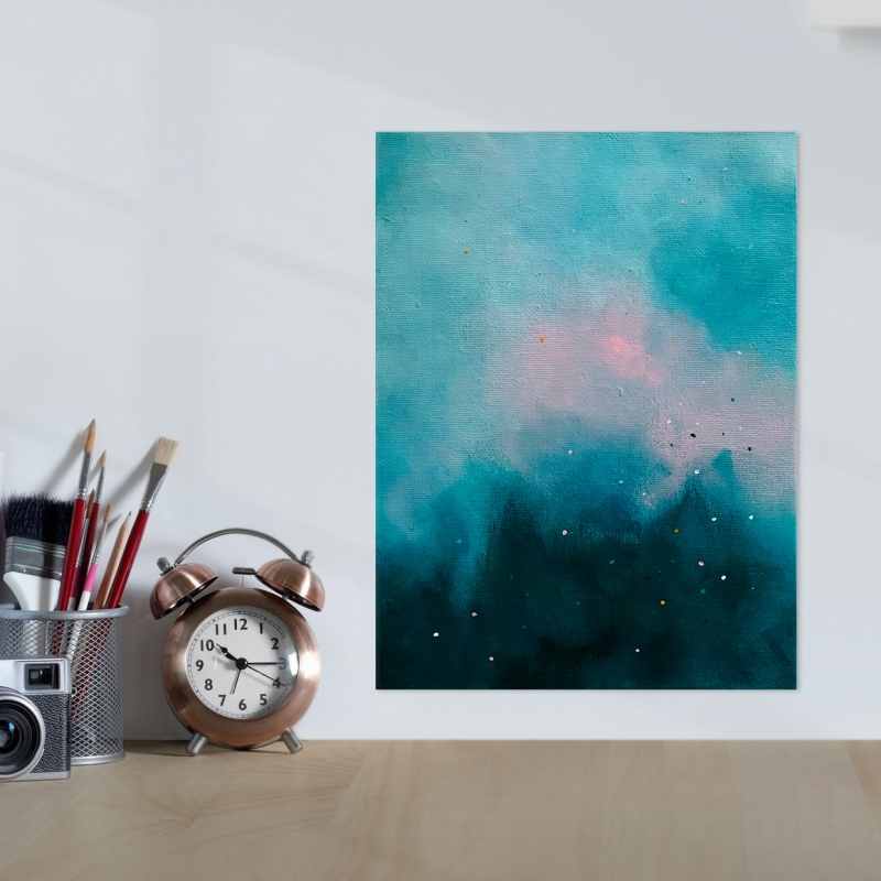 Kuvaus: Pieni sinisävyisen utuinen abstraktimaalaus. Tämä teos on maalattu pinkopahvilevylle, signeeraus takana. Ensimmäinen kolmen maalauksen sarjasta.