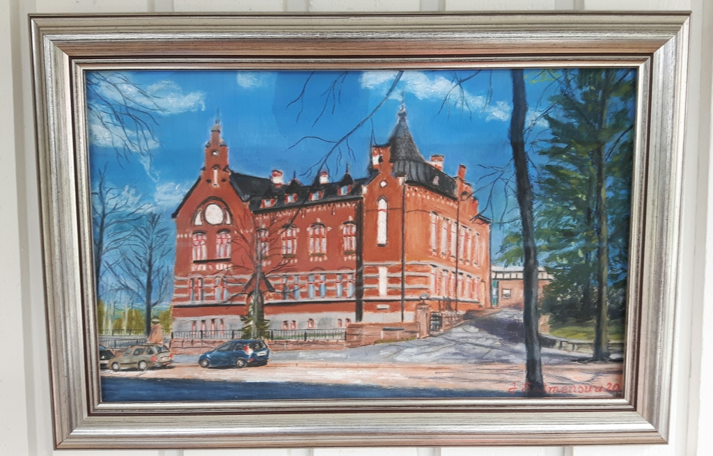 Kuvaus: Rakennuksen tornit kurottavat kohti syvänsinistä taivasta, aivan kuten tuhannet opiskelijat ovat kurottaneet kohti unelmiaan näiden seinien sisällä jo yli sadan vuoden ajan. Alhaalla kadulla nykyaikaiset autot muistuttavat ajankulusta, mutta itse koulu seisoo vankkana paikallaan-se on kuin silta Lahden menneisyyden ja tulevaisuuden välillä.