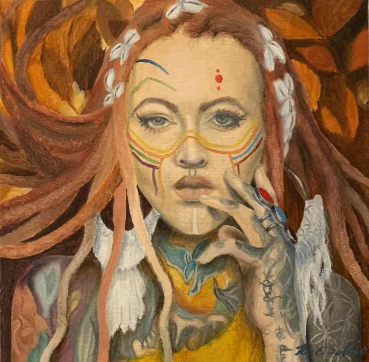Kuvaus: Taulusarja, jonka keskiosassa mietteisen naisen kasvot. Kehyksinä toimivat yksiväriset maalukset.