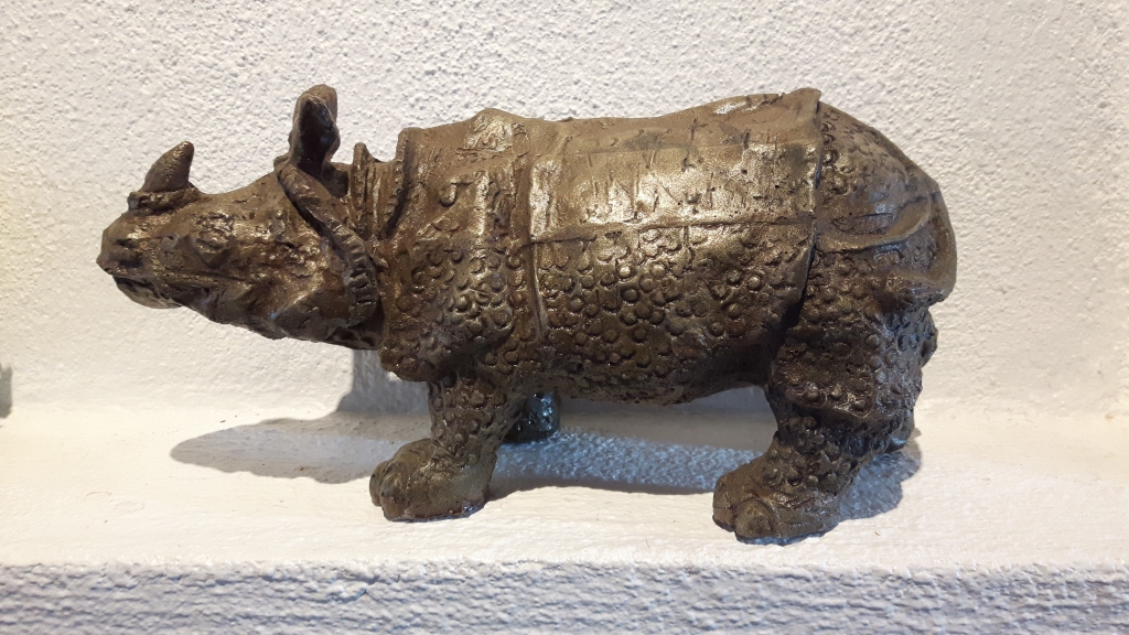 Kuvaus: Massiivinen sarvikuono. Tehty pronssi/hartsi seoksesta.