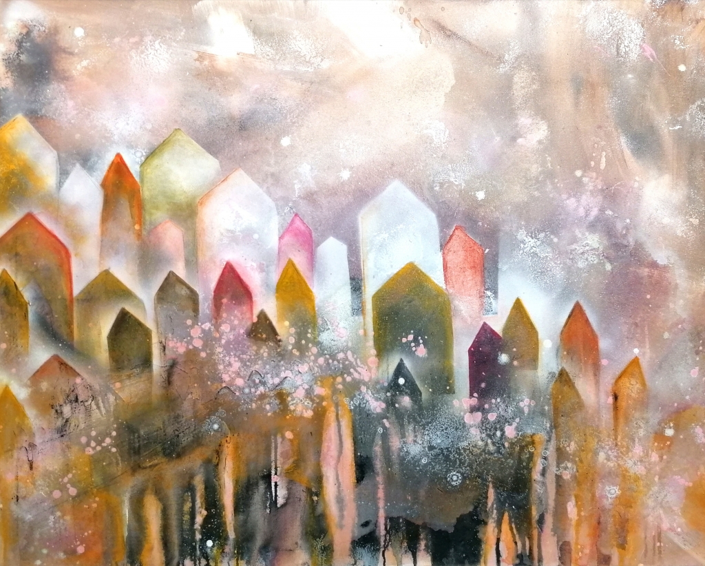 Kuvaus: Akryyleilla tehty sekatekniikalla canvaspohjalle. Ripustusvalmis. Takana on metallilanka.