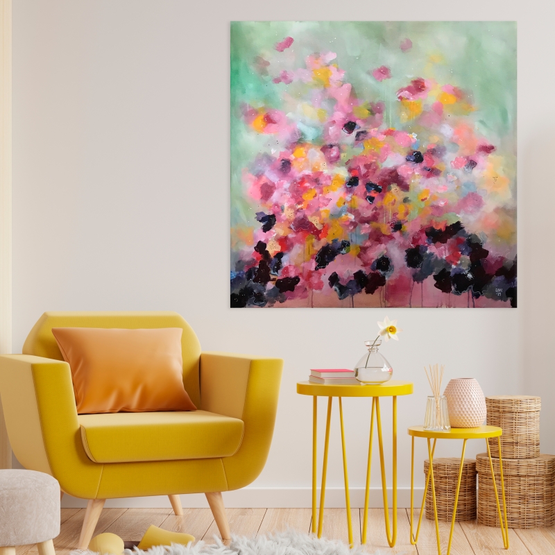 Kuvaus: Paksureunainen, abstraktimaalaus kukkakedosta hehkuu kesän väreissä. Tämä teos piristää sisustustasi! Teoksen reunat on maalattu, joten voit ripustaa tämän seinällesi myös ilman kehystystä.