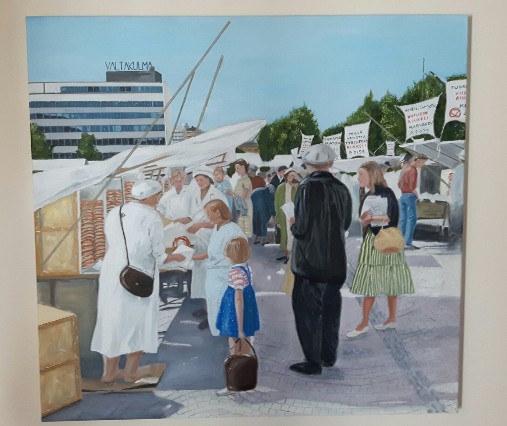 Kuvaus: On kirkas keskiviikkoaamu Lahden kauppatorilla vuonna 1958. Ilmassa sekoittuvat vastaleivotun viipurinrinkelin tuoksu, hevosten kavioiden kopina mukulakivillä ja iloinen puheensorina. Taustalla kohoaa moderni Valtakulman rakennus, joka muistuttaa kaupungin kasvusta ja uudesta ajasta, mutta täällä kojujen välissä aika tuntuu pysähtyvän.