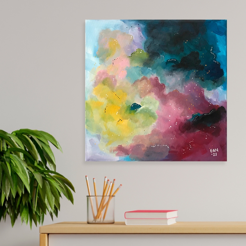 Kuvaus: Värikäs abstraktimaalaus piristämään syksyäsi! Tämän teoksen reunat on maalattu ja voit laittaa sen seinällesi ilman erillistä kehystämistä.