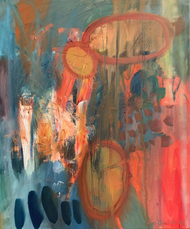 Kuvaus: Abstrakti maalaus. Toistuvien kuvioiden rytmiä. Värien kiehtova leikki. Reunat maalattu. Ripustusvalmis.