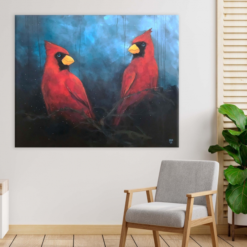 Kuvaus: Suurikokoinen sinitaustainen maalaus kahdesta kardinaalista yön pimeydessä. Tämän teoksen reunat on maalattu, joten voit ripustaa sen seinällesi ilman erillistä kehystämistä.
