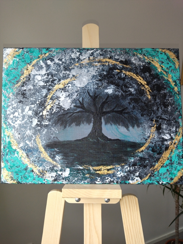 Kuvaus: Akryyli, kullanhohtoinen, reunat maalattu, signeerattu, suojalakka